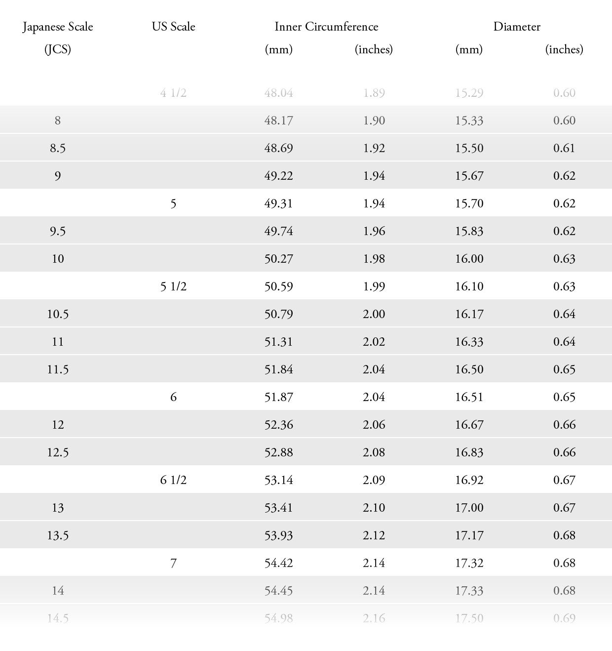 The chart below shows the corresponding measurements for ring sizes on the Japanese and the US scale. If you know your US ring size or ring measurements in millimeters or inches, you can use that information to determine the nearest Japanese ring size. Click the “View Full Chart” button to see Japanese rings sizes 1-30. You can also use the Ring Sizing Kit to get a feel of each Japanese ring size on your finger.