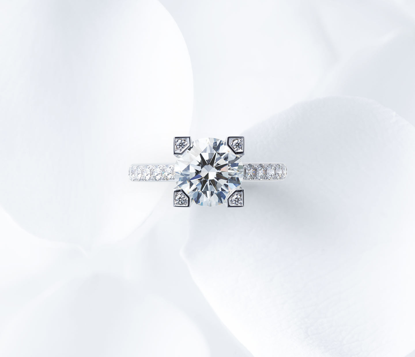 KOKORO shares its name with this beautiful character. Rendered in stylized form on two sides of the center diamond, it supports the dazzling gemstone with artistic lines of precious metal. Symbolizing sincerity, honesty and faithfulness, KOKORO encapsulates the hopeful future that becomes possible when two hearts are in love.