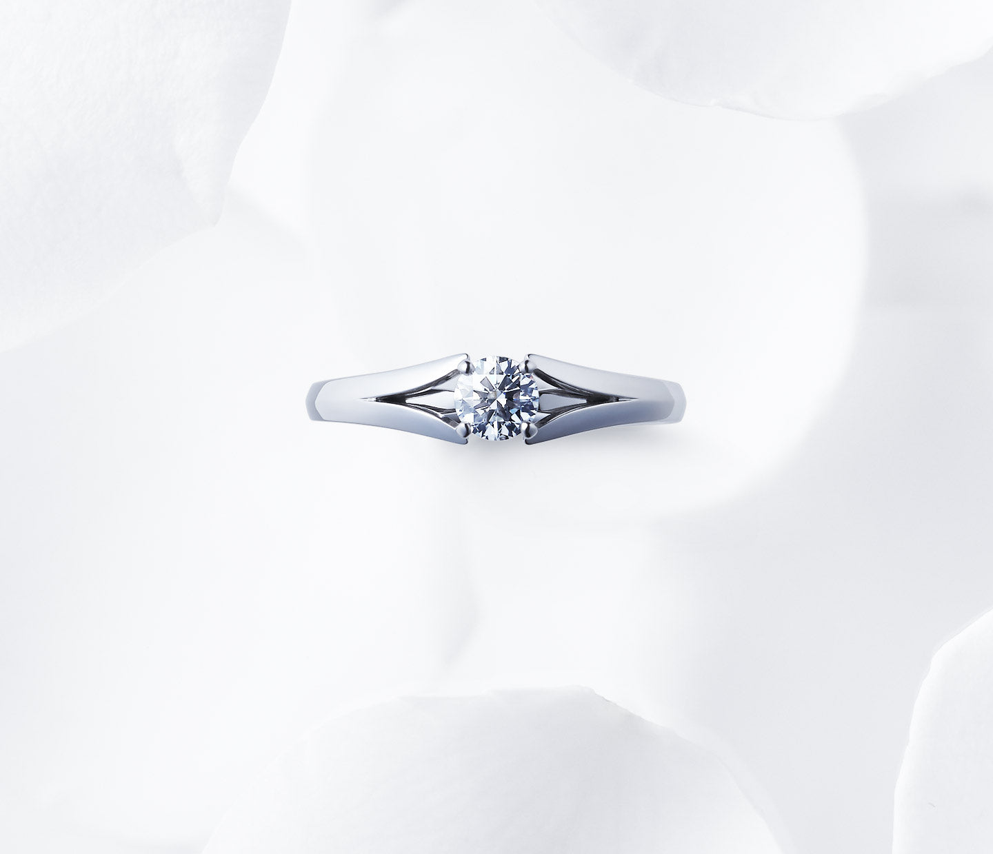 MIZUHONAMI takes its name from these golden waves, and the ring itself illustrates the idyllic scene. The diamond shines in the center, representing the sun, supported on both sides by a gently curved band evoking the softly swaying rice plants. This beautiful design embodies a wish for the new couple to have a bright and bountiful future.