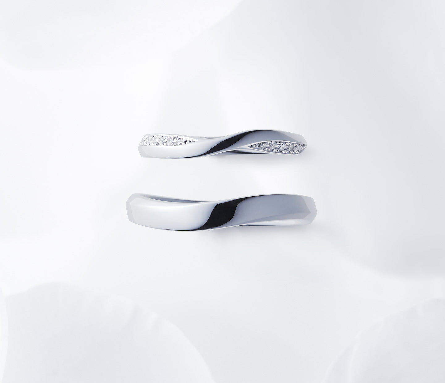 AKANEGUMO takes its name from a word that describes clouds colored by the dawn. The gentle curves along the band represent a line of clouds catching the light of the rising sun, while the placement of melee diamonds replicates the play of light between the clouds in sparkling gemstones. Just like the warm clouds of a new day, AKANEGUMO embodies the boundless future that awaits the newly married couple.