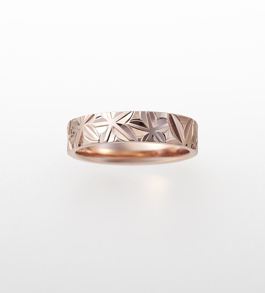 AKI NO KURENAI, poetically written as the “scarlet of fall”, features engravings of Japan’s famous momiji maples. Layers of overlapping leaves paint the gorgeous scenery of autumn across the ring band, representing the faith that you will live a life as vibrant as the autumn colors.