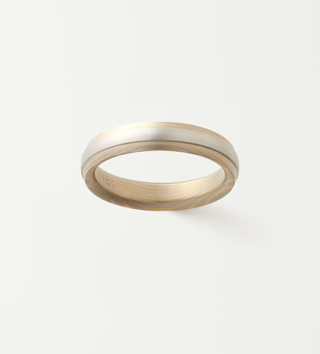 Much like the rings of a tree tell the story of life, the KYO MOKUME collection represents the months and years spent in love by combining the most precious of metals to form a gorgeous wood grain pattern. NIWAKA has taken the time-honored mokume art to even greater heights by making use of both traditional and modern metalworking techniques. The rings in this collection are well suited to stacking or pairing with other jewelry, and their refined lines and smooth inner bands make them incredibly easy to wear.-