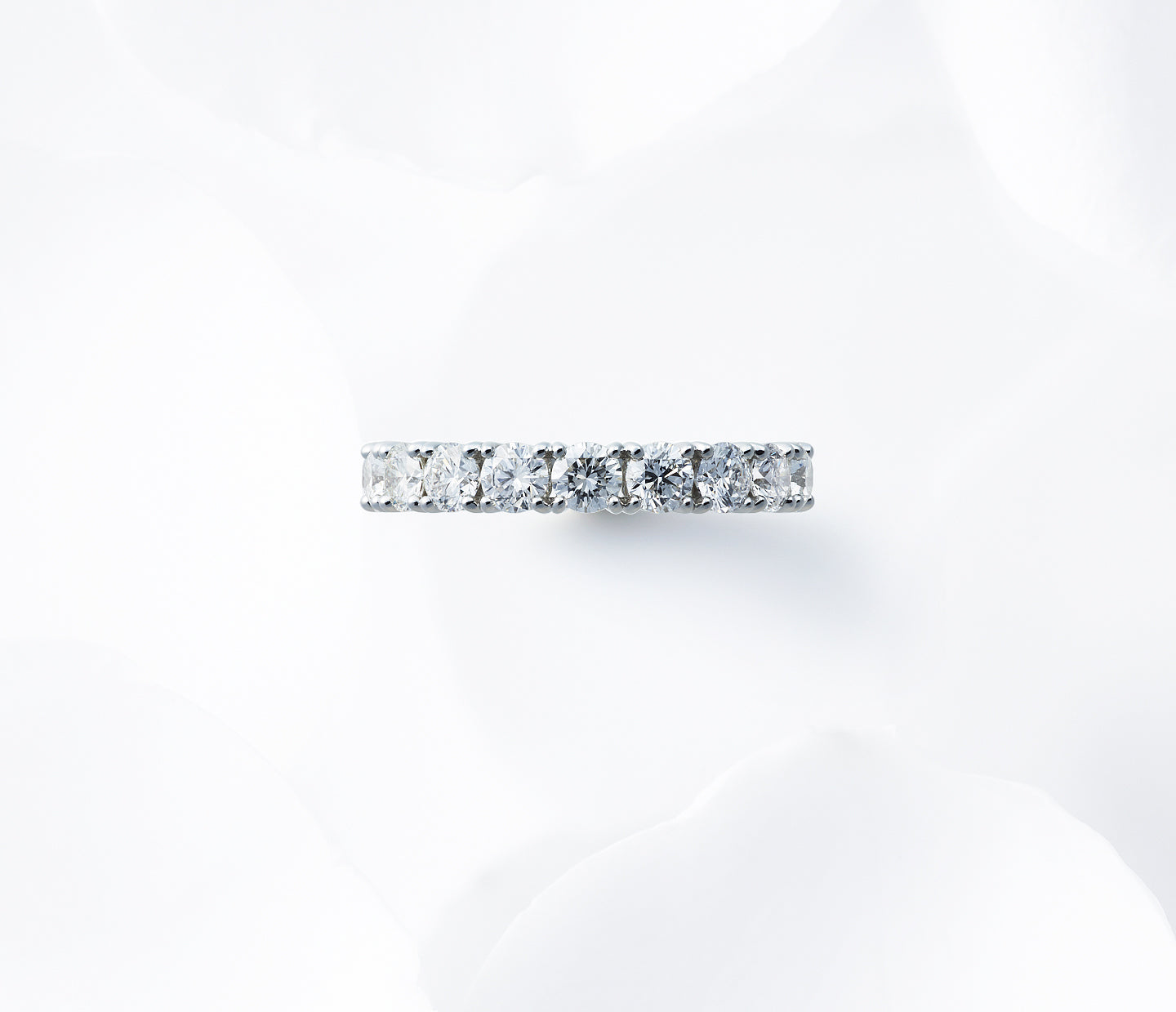 KUON, meaning “eternity”, is inspired by the traditional Japanese pattern of overlapping waves called seigaiha. Used for centuries as an auspicious pattern on kimono and in various classic arts, seigaiha adorns the sides of the KUON ring band as a line of waves topped with sparkling diamond crests. Like the timeless rhythm of a calm sea, KUON is meant to bless the newly married couple with a life of tranquility.