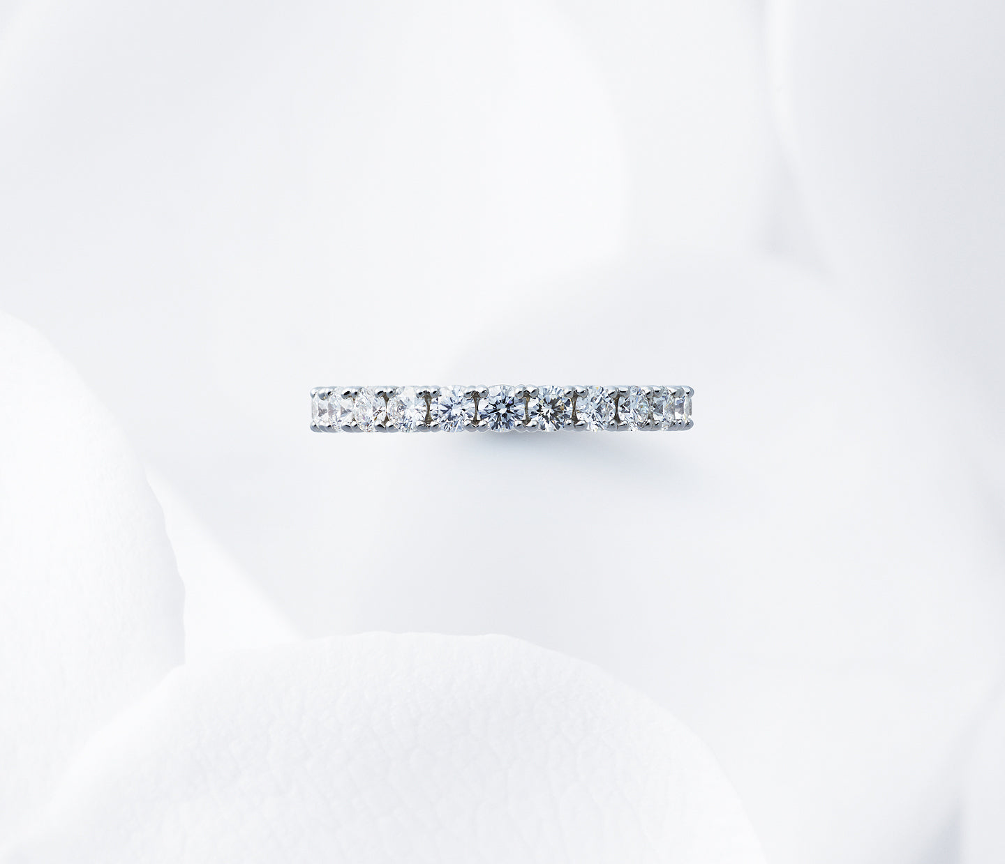 KUON, meaning “eternity”, is inspired by the traditional Japanese pattern of overlapping waves called seigaiha. Used for centuries as an auspicious pattern on kimono and in various classic arts, seigaiha adorns the sides of the KUON ring band as a line of waves topped with sparkling diamond crests. Like the timeless rhythm of a calm sea, KUON is meant to bless the newly married couple with a life of tranquility.