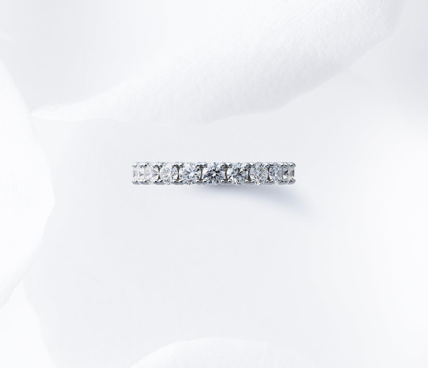 KUON, meaning “eternity”, is inspired by the traditional Japanese pattern of overlapping waves called seigaiha. Used for centuries as an auspicious pattern on kimono and in various classic arts, seigaiha adorns the sides of the KUON ring band as a line of waves topped with sparkling diamond crests. Like the timeless rhythm of a calm sea, KUON is meant to bless the newly married couple with a life of tranquility.