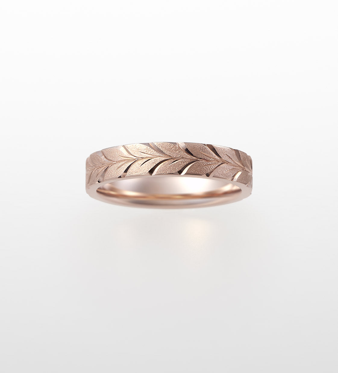 YUKITSUBAKI shares its name with a variety of camellia known for its resilience in even the snowiest of regions. Engravings of interlocking camellia leaves circle the ring band, their subtle texture creating an impression of freshly fallen snow. YUKITSUBAKI expresses the wish for your love to remain strong and true throughout the years.