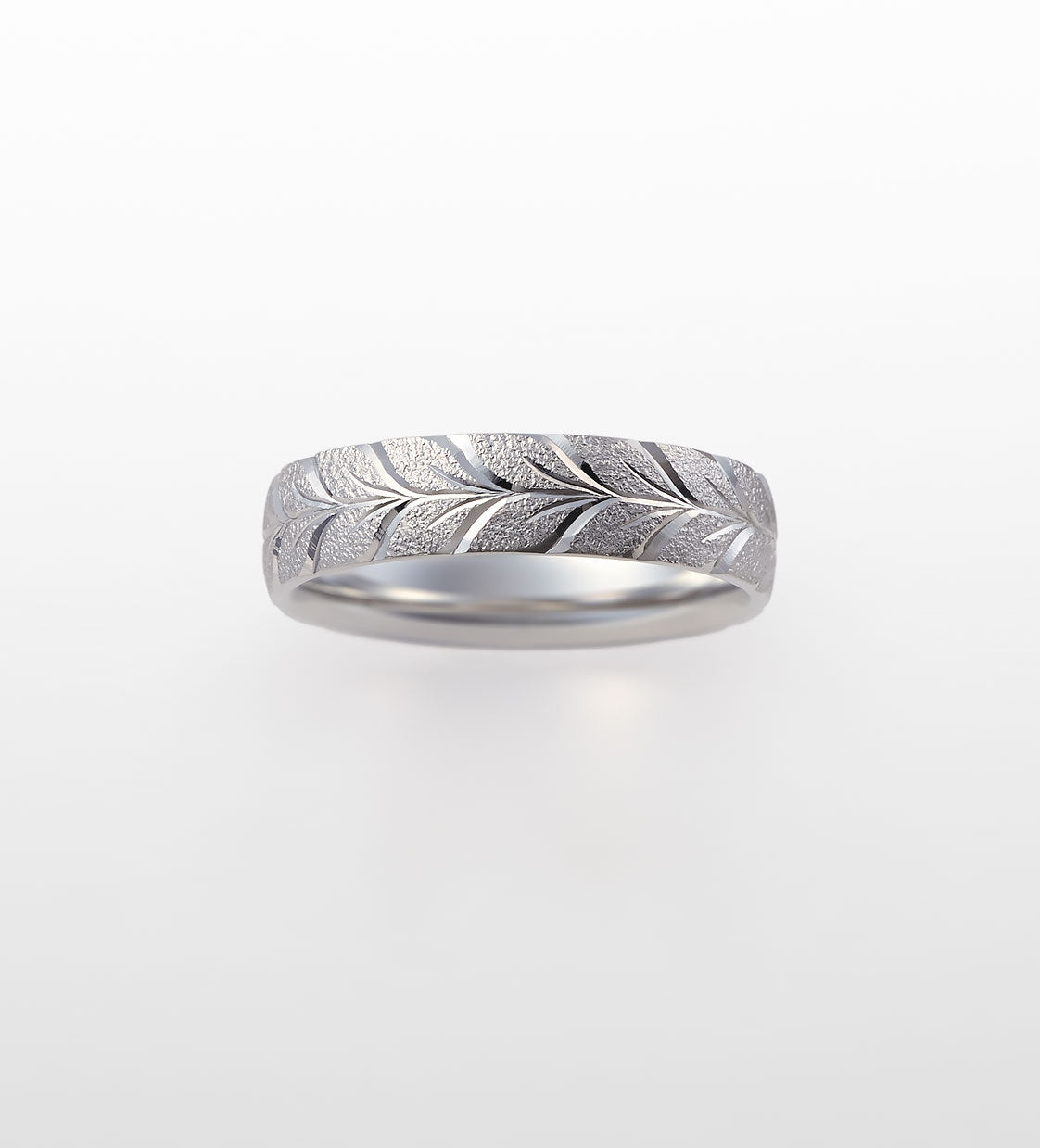 YUKITSUBAKI shares its name with a variety of camellia known for its resilience in even the snowiest of regions. Engravings of interlocking camellia leaves circle the ring band, their subtle texture creating an impression of freshly fallen snow. YUKITSUBAKI expresses the wish for your love to remain strong and true throughout the years.