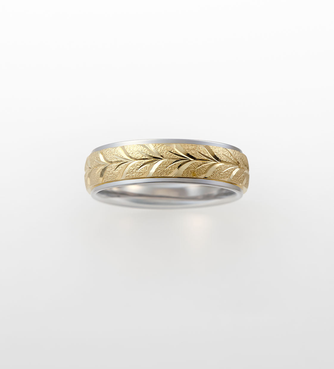 YUKITSUBAKI shares its name with a variety of camellia known for its resilience in even the snowiest of regions. Engravings of interlocking camellia leaves circle the ring band, their subtle texture creating an impression of freshly fallen snow. YUKITSUBAKI expresses the wish for your love to remain strong and true throughout the years.